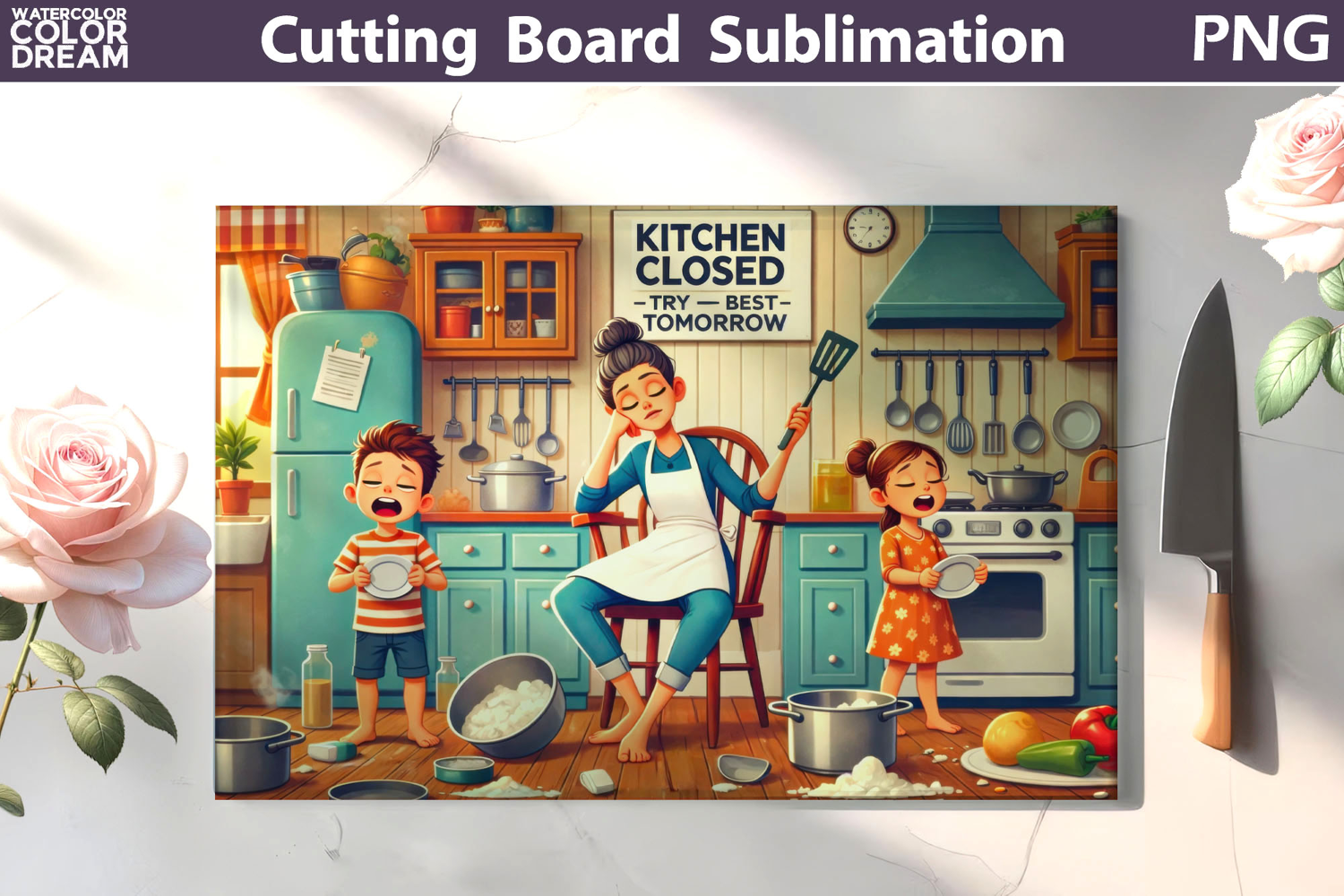 Mothers Day Cutting Board Funny Mom Cooking Chaos Kitchen Illustration Kitchen Closed Mom Tired Funny Scene Kitchen Closed Sign Cooking Humor Design Tired Mom Kitchen Mess Funny Artwork Family Kitchen Chaos Mom Illustration Design Funny Cooking Fail Kitchen Mom Artwork Playful Kitchen Humor Mom Tired Scene Cute Kitchen Decor Mom Chaos Illustration Colorful Kitchen Illustration Mom Funny Scene