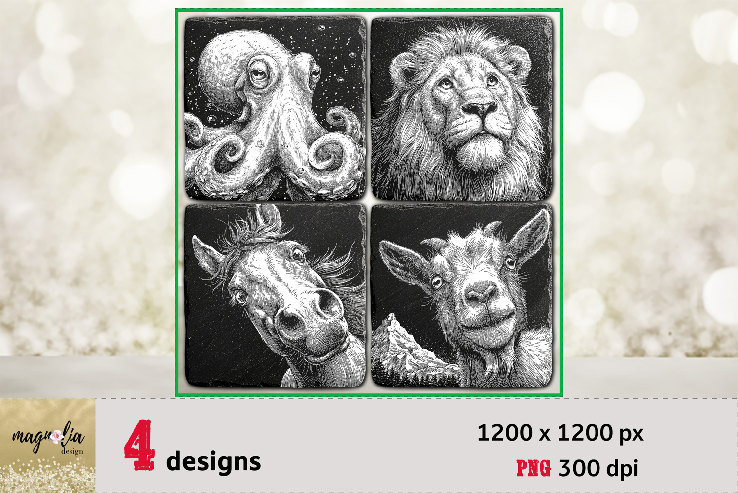 Funny animals slate coaster engraving bundle png - goat, horse, octopus, lion