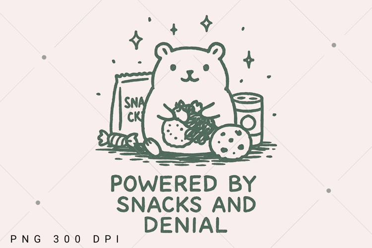 Cute Funny Snack Bear PNG, Powered By Snacks and Denial Png, Kawaii Animal Clipart, Sarcastic Quote PNG, Funny Food Lover PNG