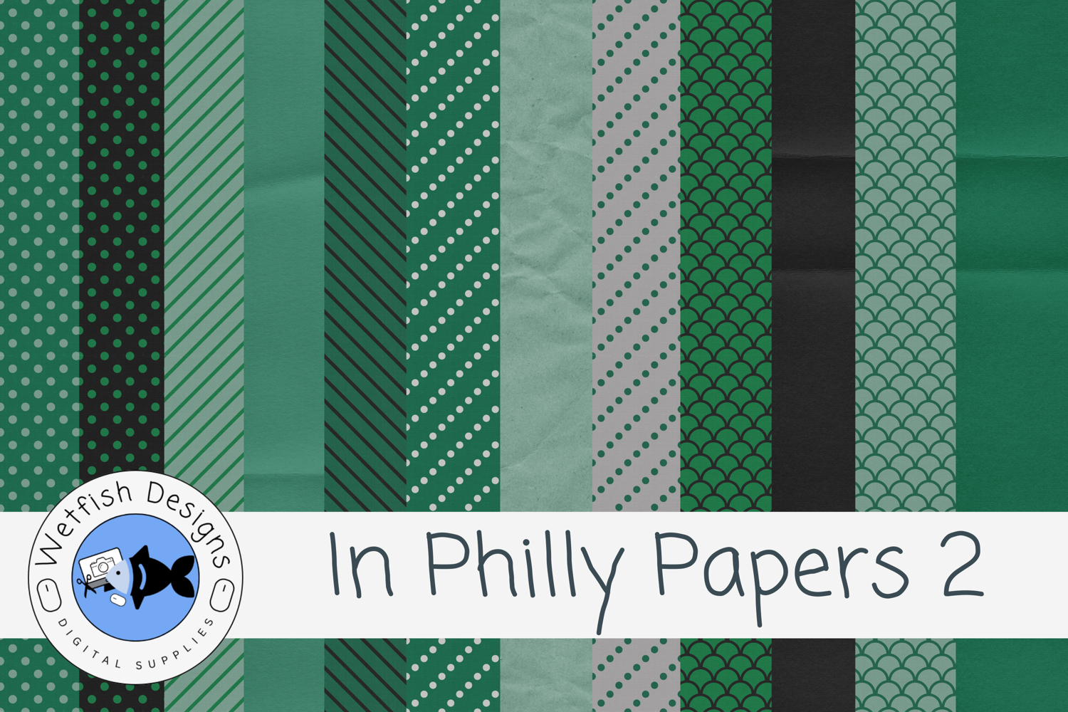 Show your Philadelphia pride with the In Philly Paper Pack! This collection includes 12 high-quality digital papers featuring a bold palette of Emerald Green, Black, grey, and white. With a mix of playful patterns, this versatile pack is perfect for capturing the excitement of game day, city pride, or school spirit.