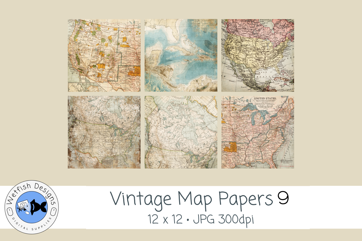 Vintage Map Papers 9 – 12×12 Digital Scrapbook Papers | Antique Map Backgrounds | Junk Journal Paper Pack