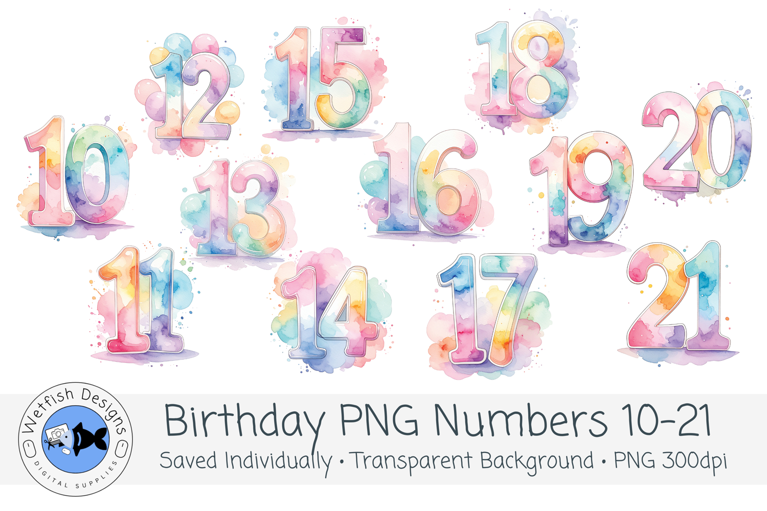 Complete your celebration designs with this extended set of Watercolor Birthday Numbers Clipart (10–21). Designed to coordinate perfectly with your 0–9 set, this collection makes it easy to create milestone and teen birthday designs with beautiful, ready-made number combinations.