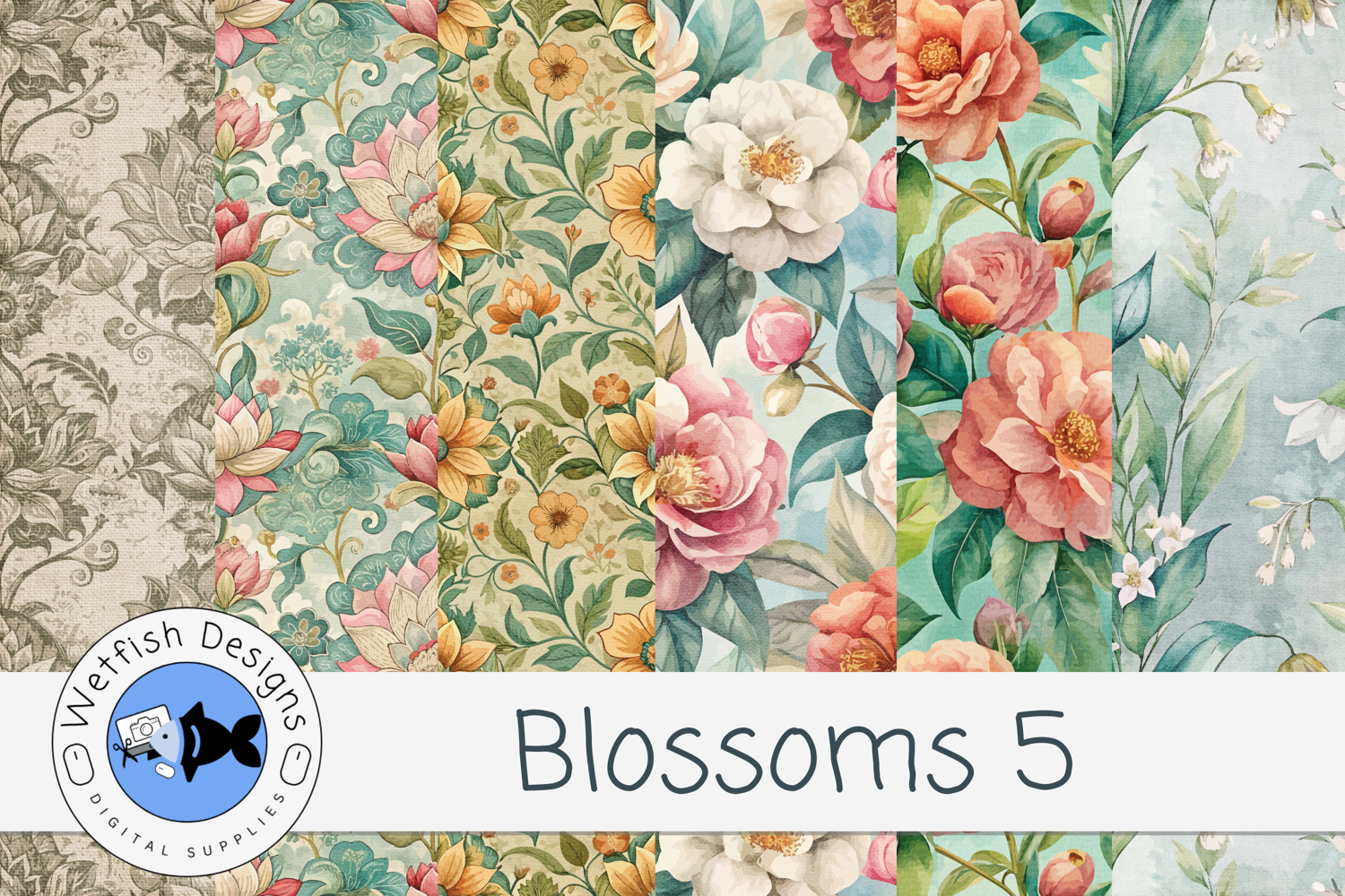 Blossoms 5 Digital Paper Pack is a beautiful collection of floral digital papers featuring painterly blooms, vintage-inspired botanicals, soft watercolor textures, and elegant garden-style patterns.