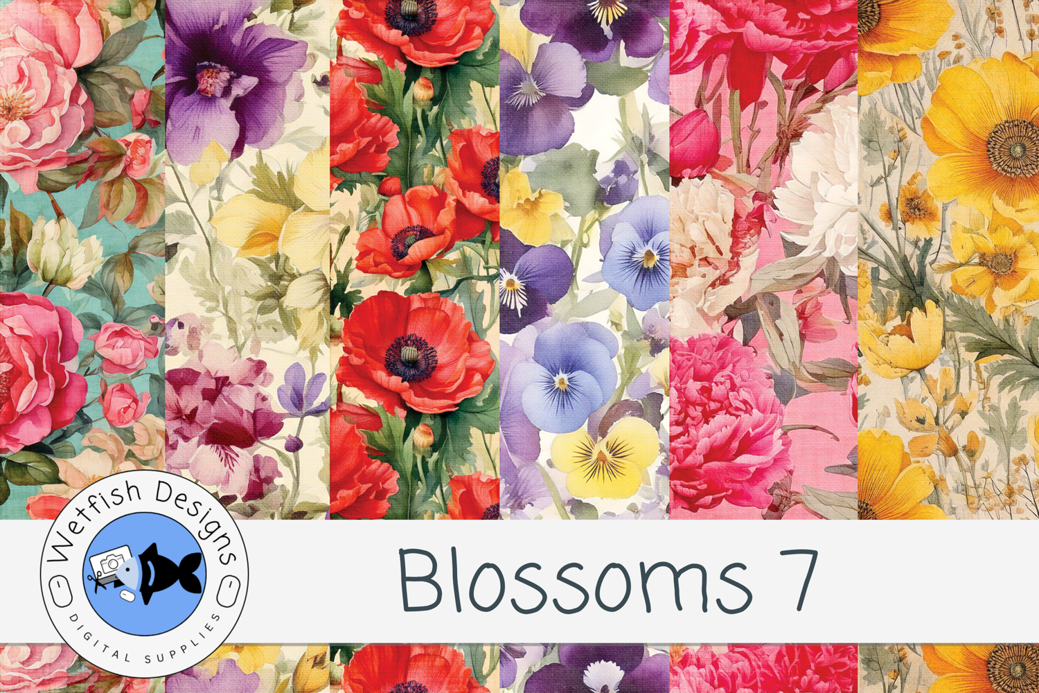 Blossoms 6 Digital Paper Pack is a beautiful collection of floral digital papers featuring painterly blooms, vintage-inspired botanicals, soft watercolor textures, and elegant garden-style patterns.