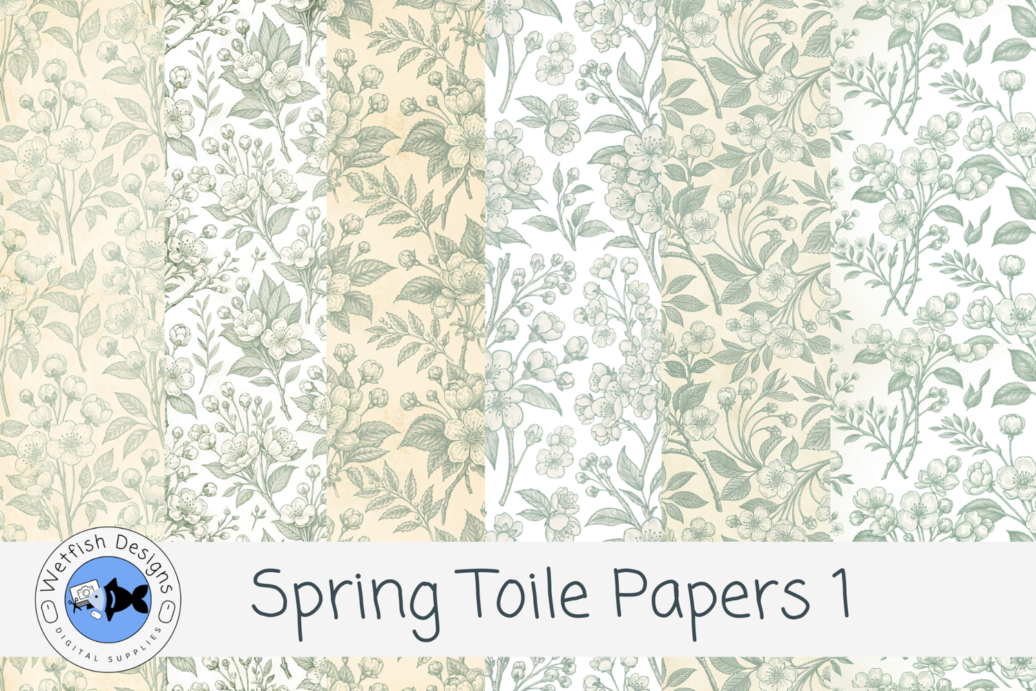 Add classic elegance to your designs with Spring Toile Papers 1. This digital paper pack includes 6 high-resolution JPG backgrounds featuring delicate botanical toile patterns in soft green tones with neutral and cream backgrounds.