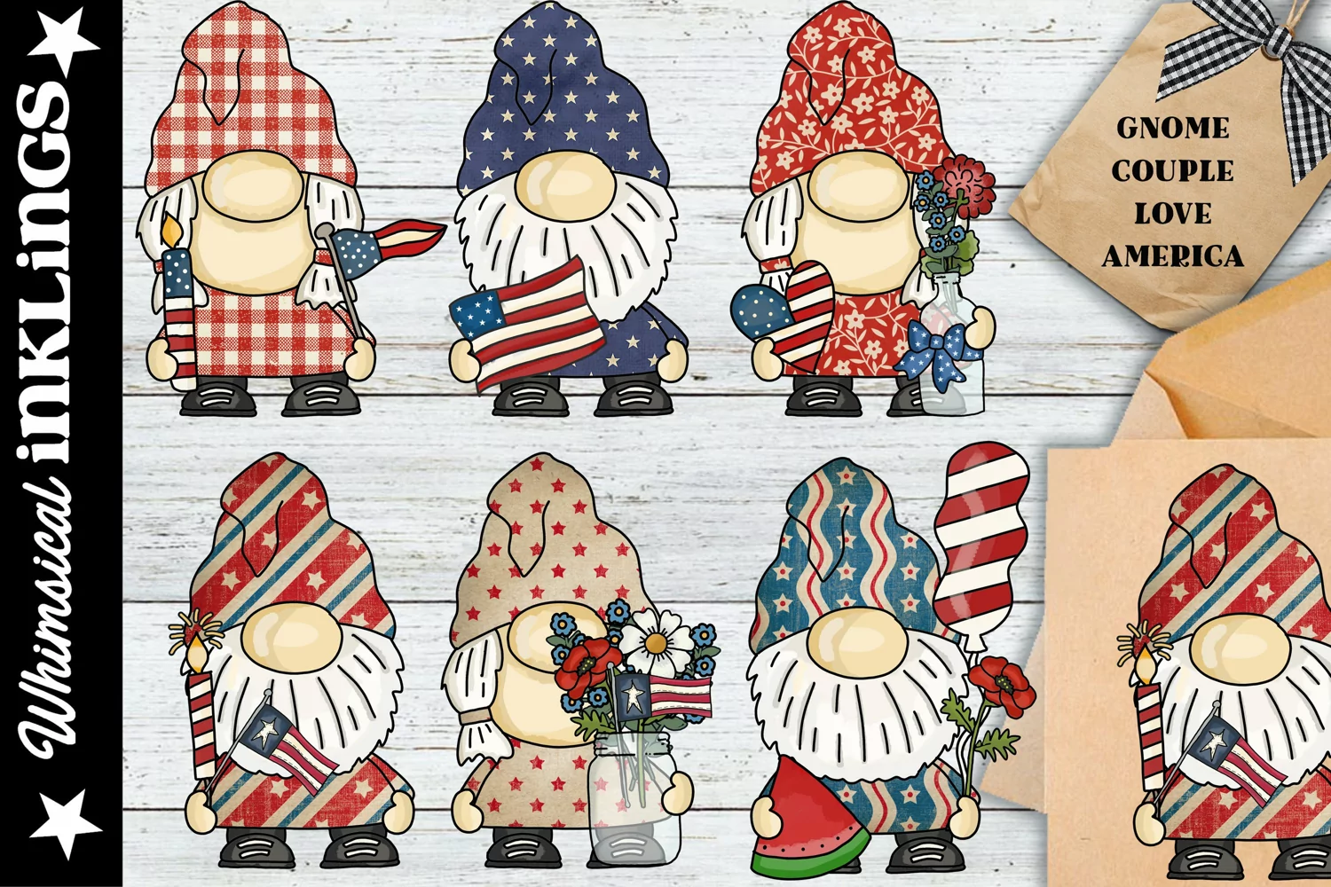 Get these 6 adorable America loving gnomes as large 300 DPI Transparent PNG images. Perfect for sublimation design, water slide decals, greeting cards, tags, labels, paper crafting and so much more!