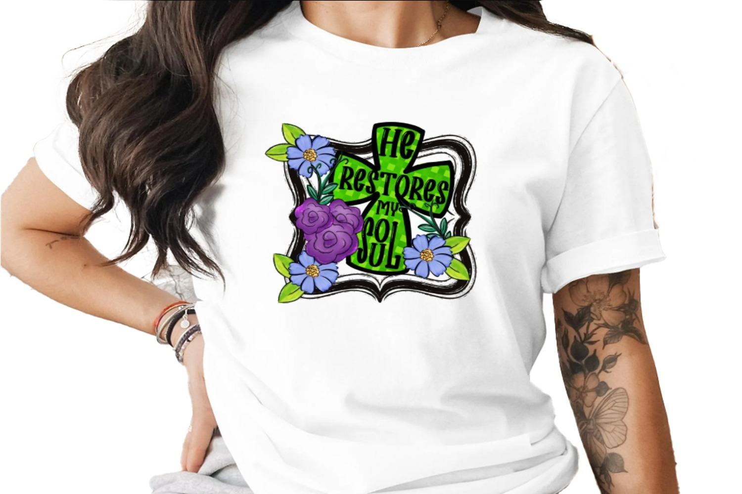 This digital design features a cross with the phrase "He Restores My Soul", beautifully adorned with flowers. The vibrant colors and meaningful message make it a perfect addition to your digital collection.