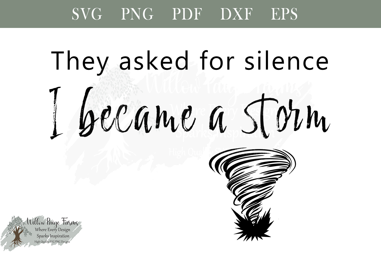 “They Asked for Silence. I Became a Storm.” paired with a striking tornado illustration crashing into the ground. This design symbolizes strength, rebellion, and the unstoppable power of finding your voice.