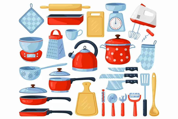 Kitchen dinnerware. Kitchenware and tableware dishes, tools, cutlery, grater, mixer and cutting board. Kitchen appliance vector illustration set. Accessory cutlery, kitchenware and dinnerware