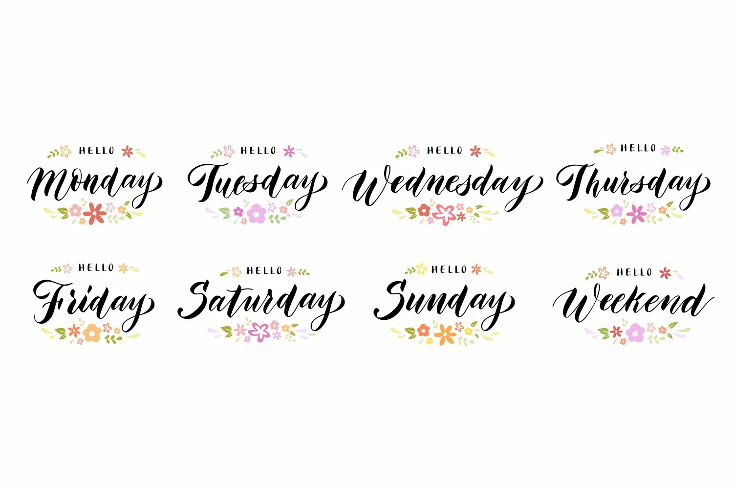 Hello week days lettering. Weekends and weekdays greeting text, positive day names calligraphy with floral ornaments vector set of week days design typography, calligraphy and letterings