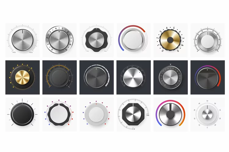 Volume control knob. Amplifier round dial level regulator, metal potentiometer knobs and audio ui knobs vector set. Minimum and maximum sound panel for electronic equipment or audio technology