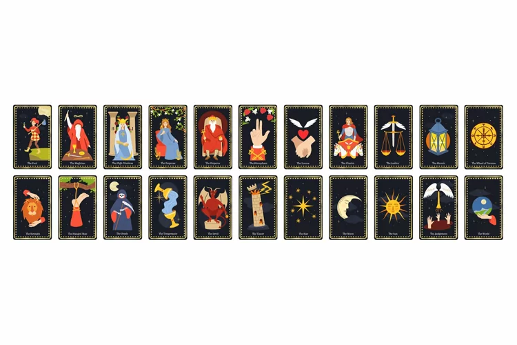 Major arcana tarot cards. Occult deck for divination with chariot, fool, magician and wheel of fortune vector set. Fortune telling and spiritual prediction. Cartoon esoteric elements