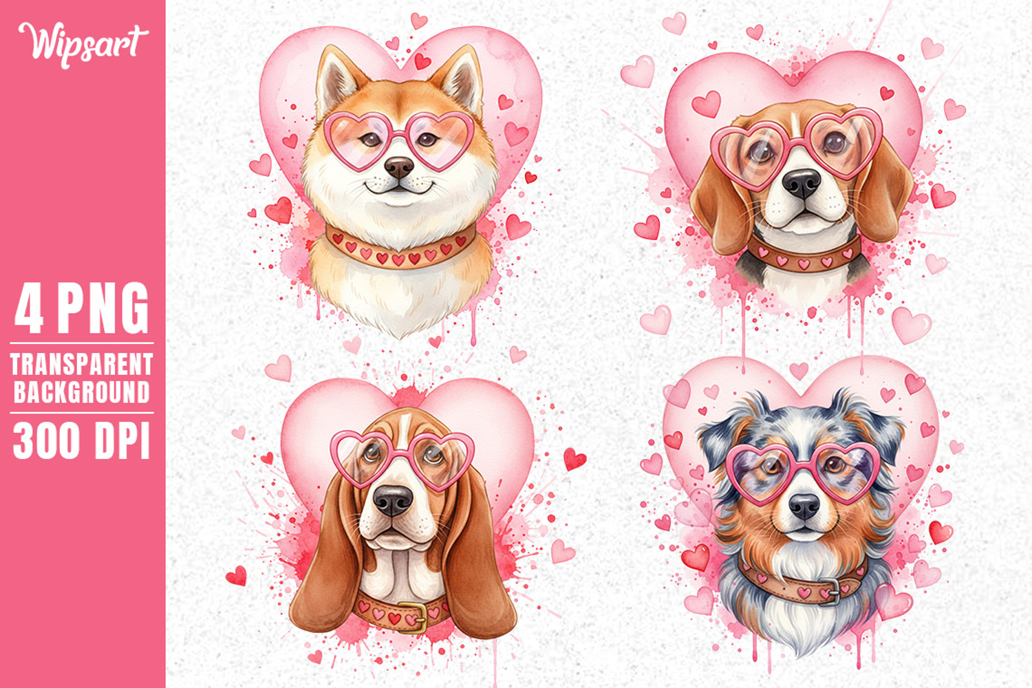 Adorable Valentine-style dog illustrations featuring Shiba Inu, Beagle, Basset Hound, and Australian Shepherd wearing heart-shaped glasses with pink heart accents. Perfect for Valentine’s Day cards, stickers, crafts, .and print-on-demand projects. High-quality transparent PNG at 300 DPI
