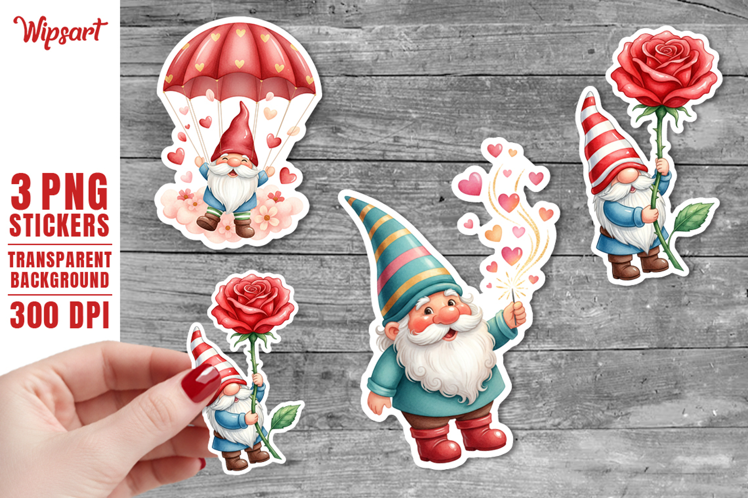 Product Name: Valentine Gnome PNG Stickers - 3 Transparent Printable Designs 300 DPI