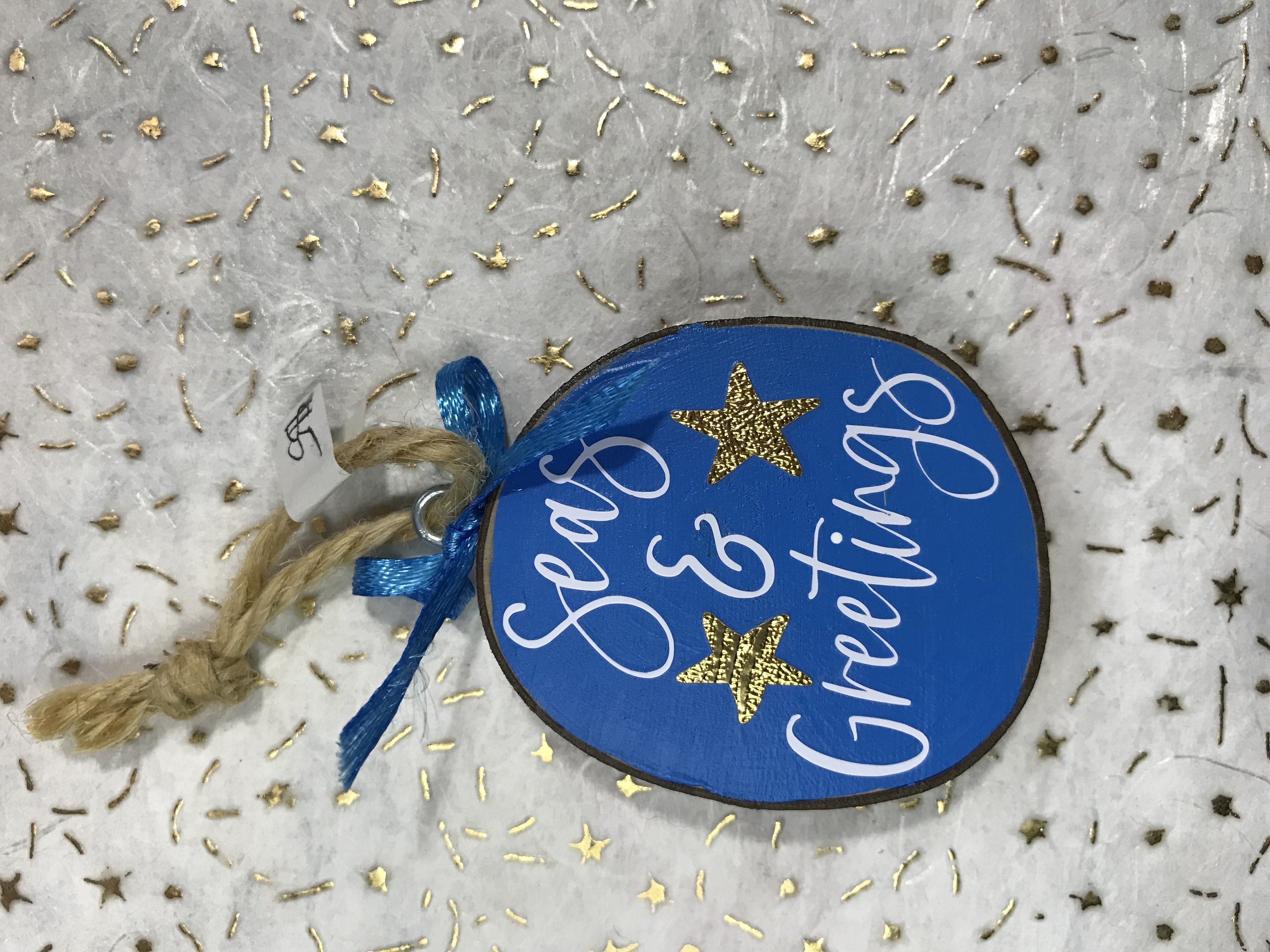 The fonts, while very pretty, were very thin and hard to manage at ornament size. I used wood rounds painted a bright blue with white vinyl lettering and gold metallic shells.