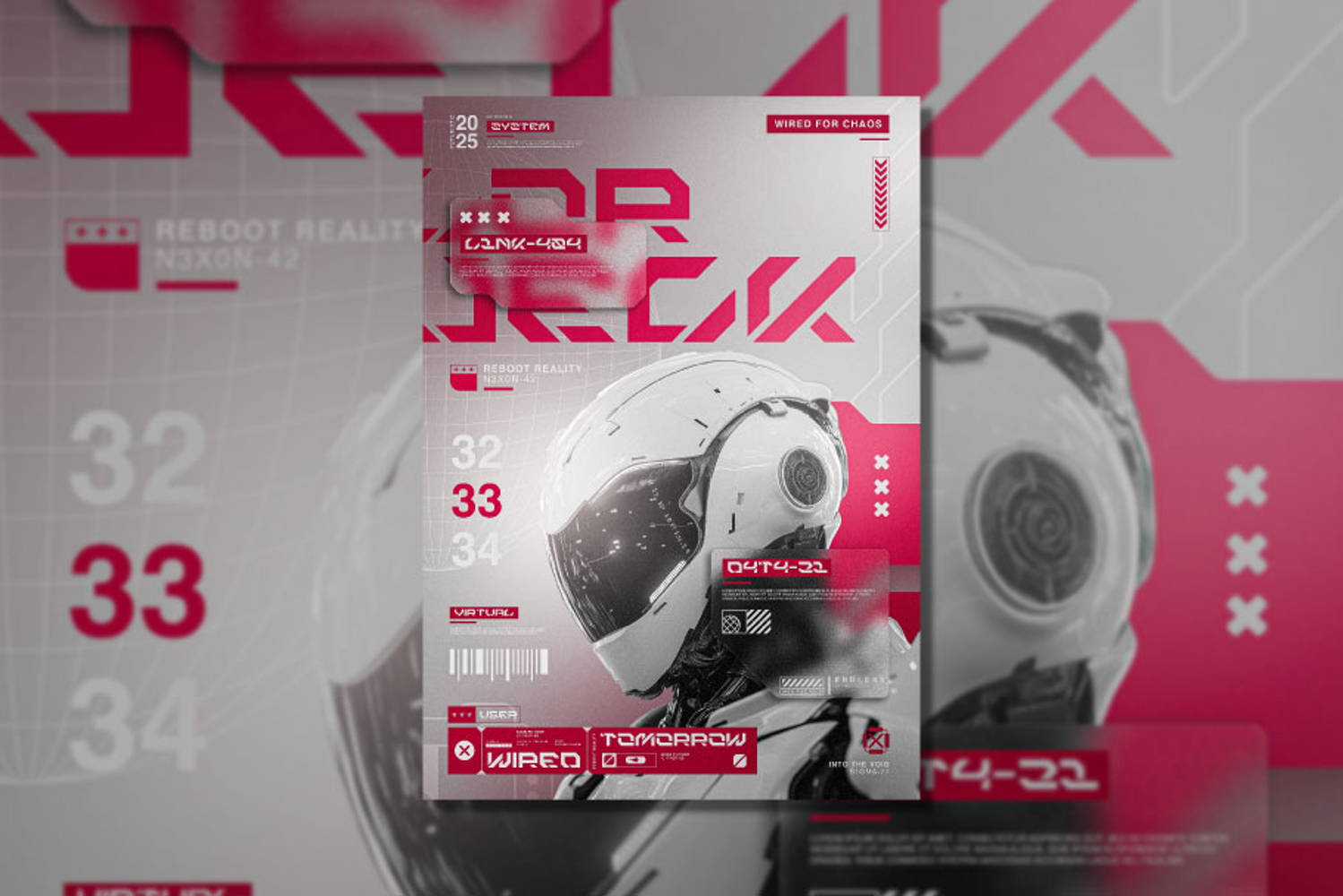 Perfect for your Cyberpunk Futuristic themed design needs, this Photoshop PSD format template is ideal for creating eye-catching posters, banners, or flyers.