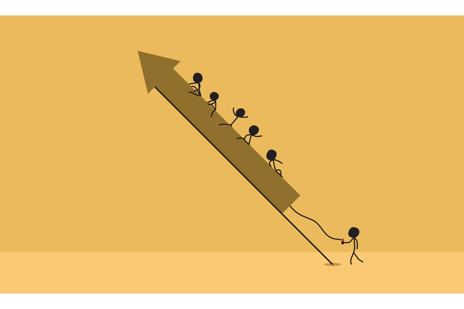 Hand-Drawn Stick Figure Illustration of a Group of People Riding a Rocket, Preparing to Take Off