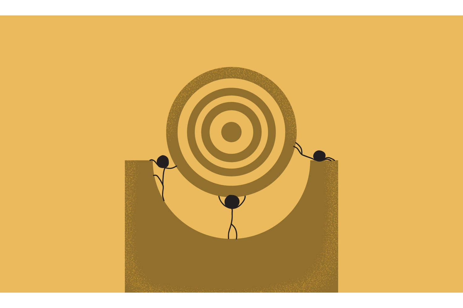 Hand-Drawn Stick Figure Illustration of a Group of People Trying and Working Together to Align and Balance a Shooting Target