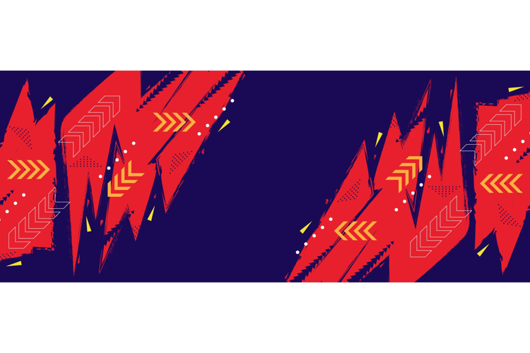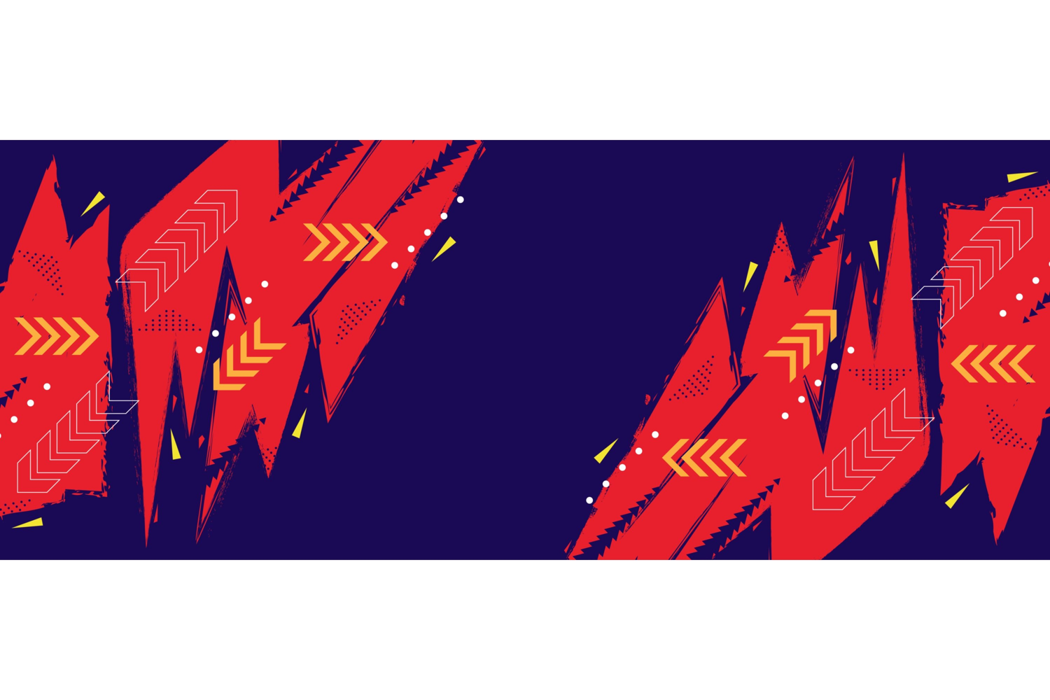 Dynamic Abstract Banner with Red Energy Zig Zag Shapes in Brush Style with Yellow Arrow Shapes on Blue Background