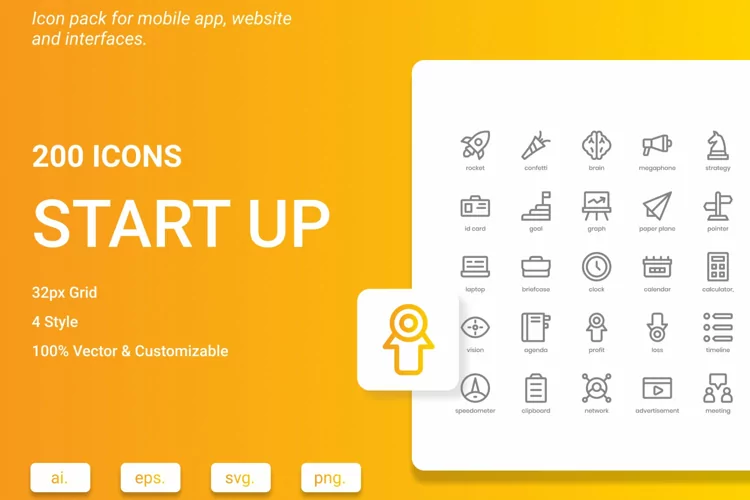 Start Up Icon Pack is composed of 200 stylish icons that showcase the most popular services and ideas. It's perfect for website design, mobile applications, presentations, analytical reports, infographics, or website templates.