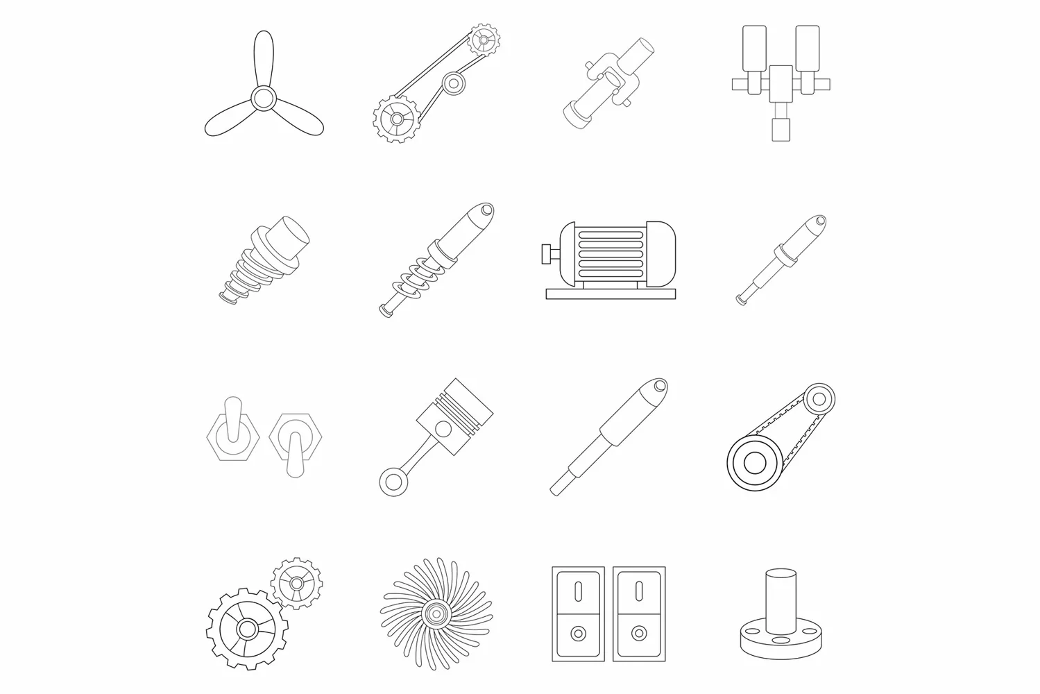 Mechanism parts set icons in outline style isolated on white background. Formats: JPG, EPS, AI, PSD, PNG, AI