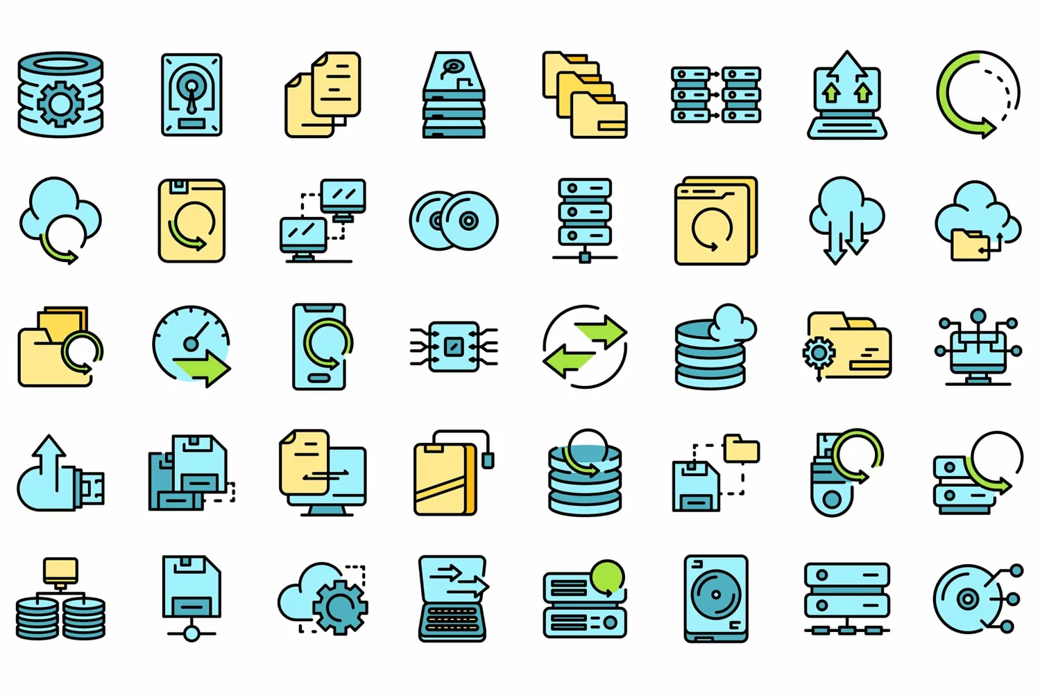 Backups icons set. Outline set of backups vector icons thin line color flat on white. Formats: JPG, EPS, AI, PSD, PNG, AI
