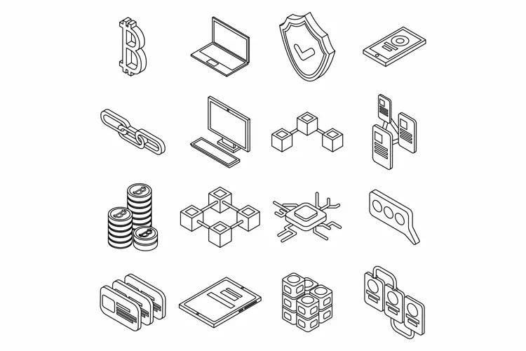 Blockchain icon set. Isometric set of blockchain vector icons outline isolated on white background. Formats: JPG, EPS, AI, PSD, PNG, AI