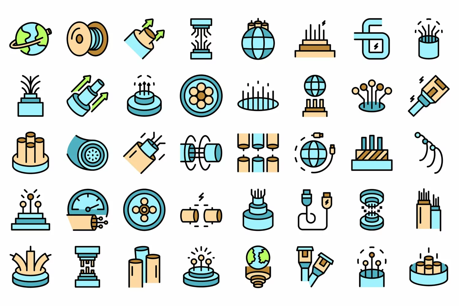 Line Thin Flat Vector Outline Color Icons Set Isolated Optic Fiber