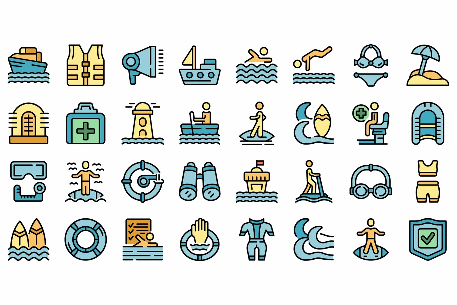 Line Thin Flat Vector Outline Color Icons Set Isolated Water Safety Training