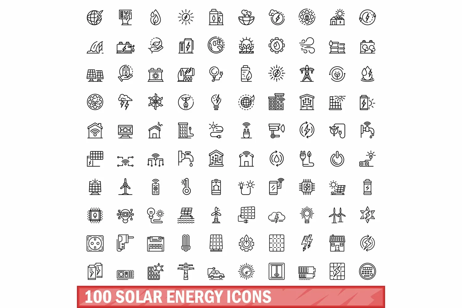 100 solar energy icons set. Outline illustration of 100 solar energy icons vector set isolated on white background. Formats: JPG, EPS, AI, PSD, PNG, AI