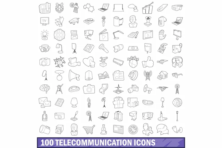 100 telecommunication icons set, outline style example image 1