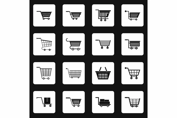 Shopping cart icons set in white squares on black background simple style vector illustration