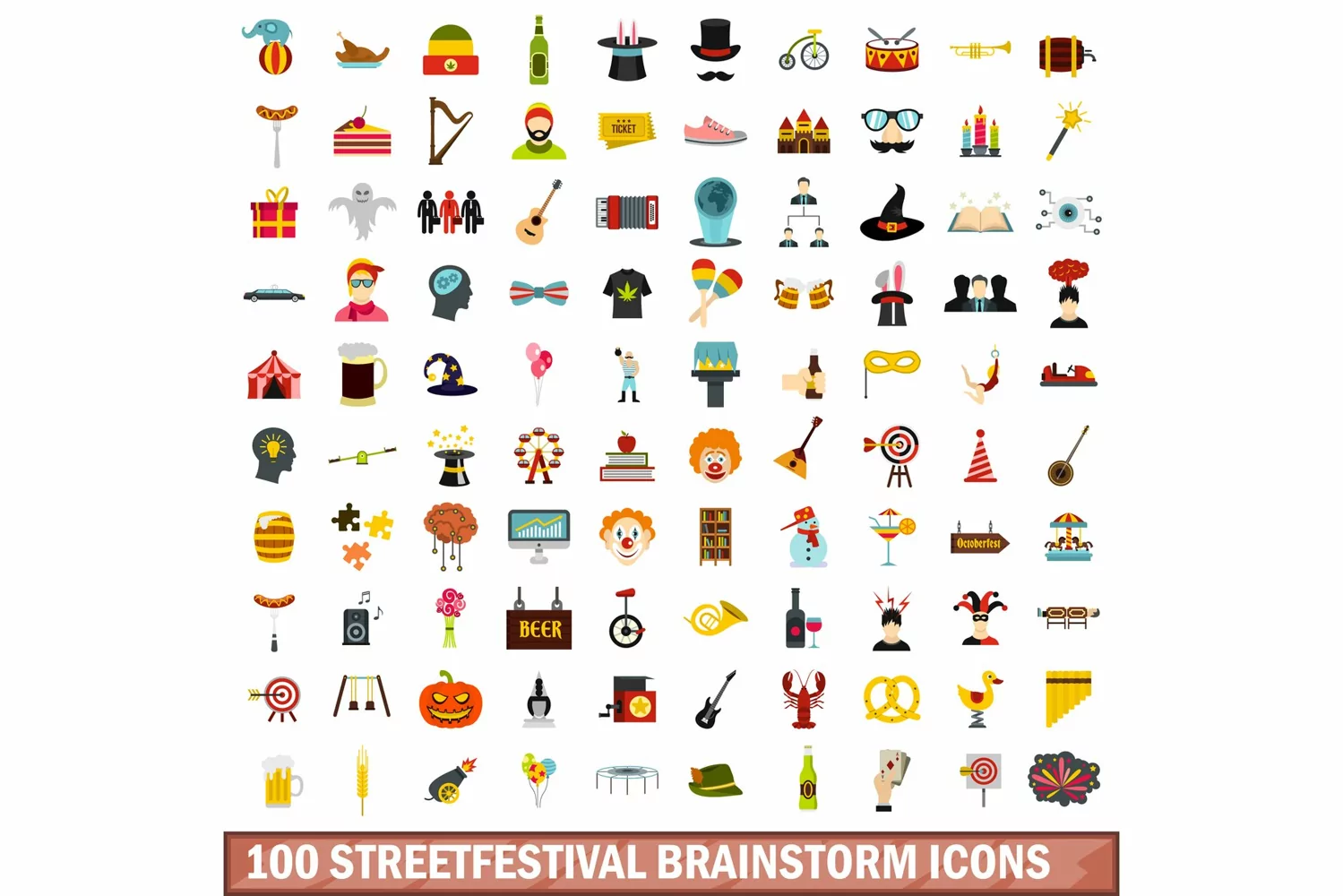 100 streetfestival brainstorm icons set, flat style example image 1