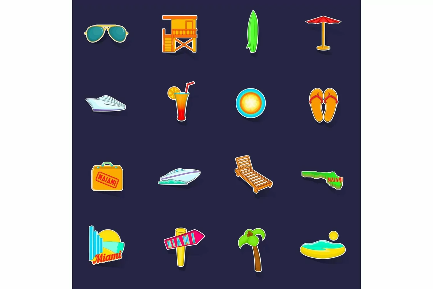 Cartoon Vector Sticker Icons Collection Beach Set Isolated Florida Miami