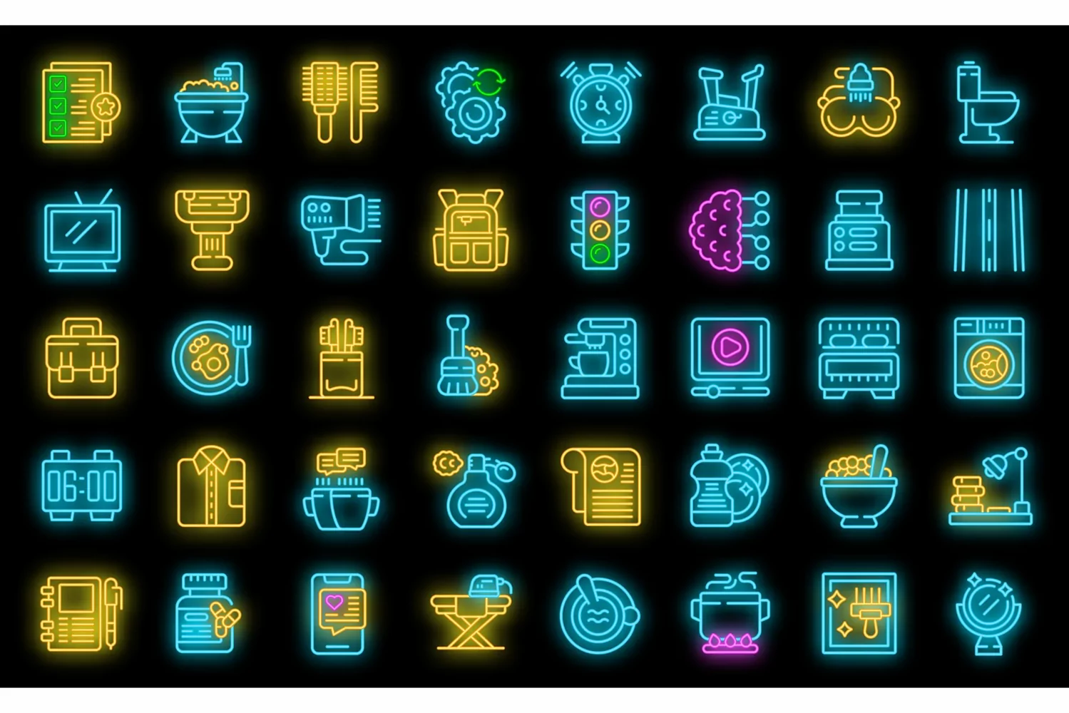 Daily routine icons set outline vector. Life daily. School sleep neon color on black