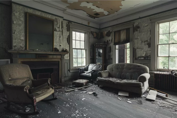 Dilapidated interior of an abandoned house with peeling walls and damaged vintage furniture