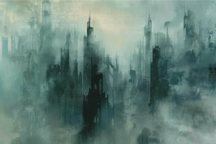 Artistic rendition of a misty cityscape, blending modern urban elements with ethereal brushstrokes