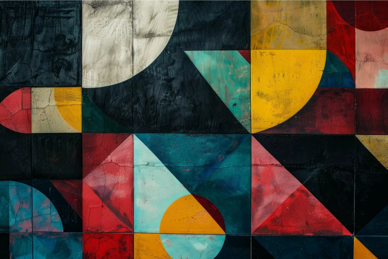 Vibrant and bold colorful abstract geometric mural on urban graffiti wall with symmetrical shapes and bright color blocking