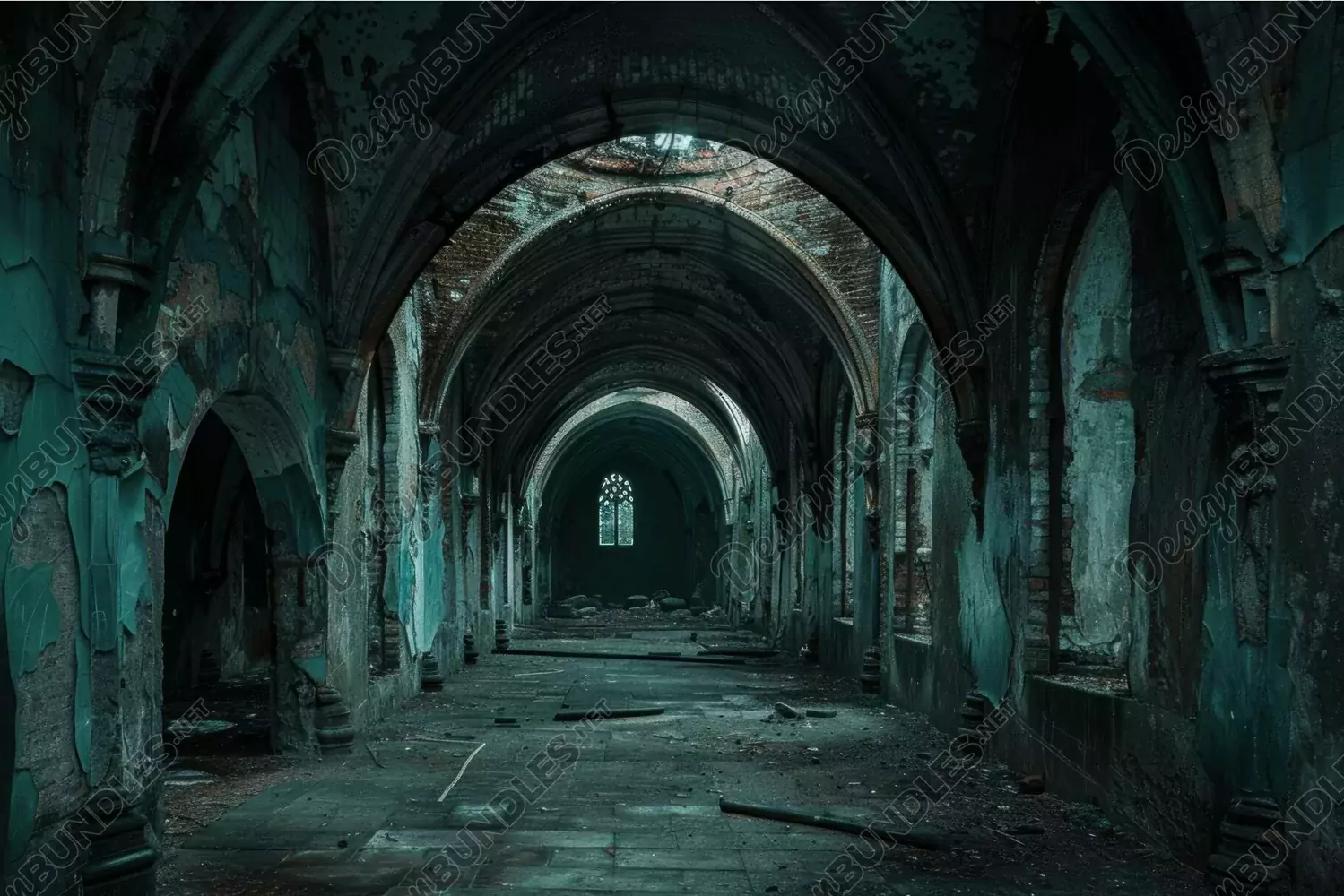 Haunting view of a decaying gothic cathedral's corridor with arches