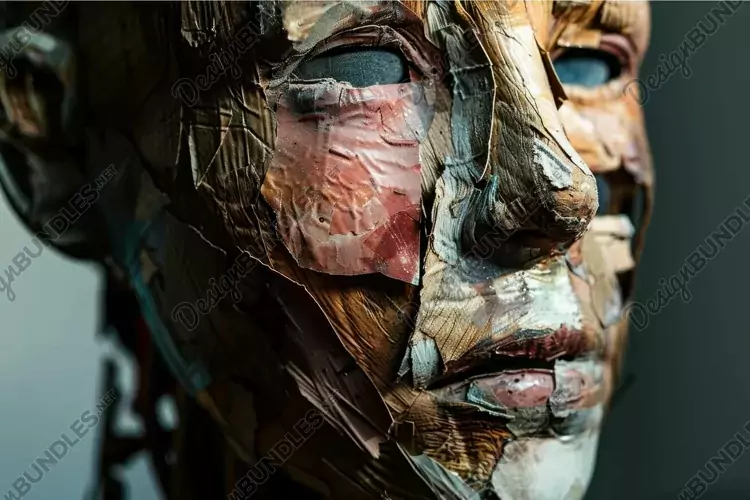 Artistic closeup of a textured human face sculpture with layered and peeling paint, showcasing intricate details