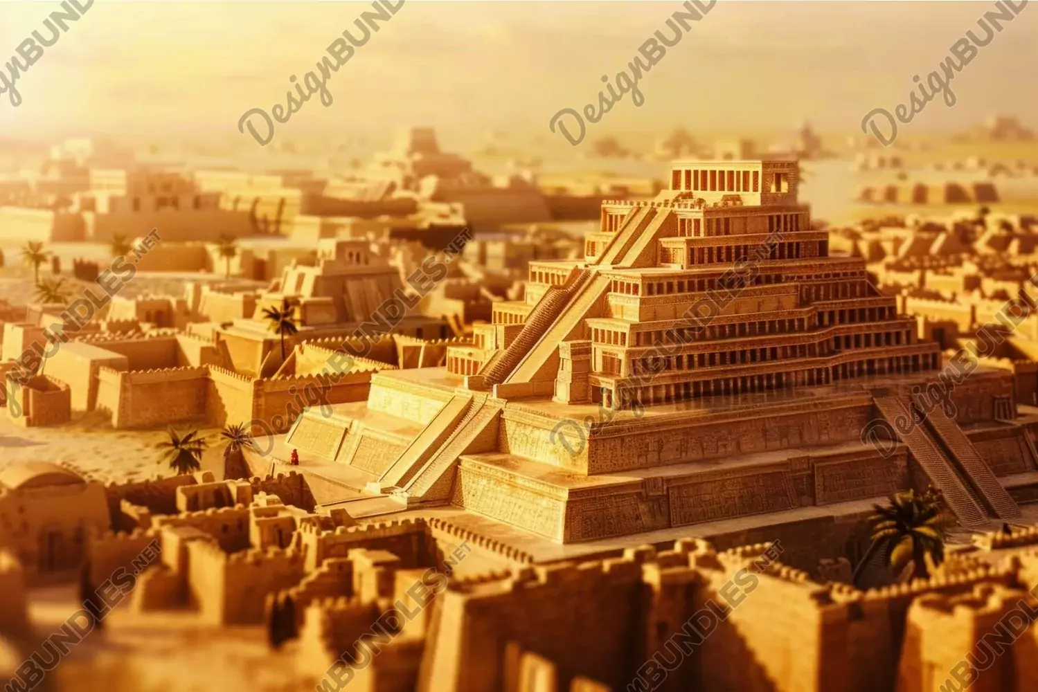 Artistic representation of a mesopotamian city with ziggurat at golden hour