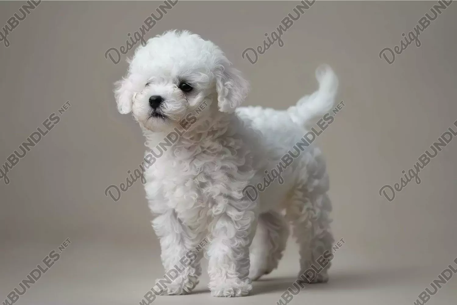 Cute small white puppy standing against a smooth beige backdrop, looking playful