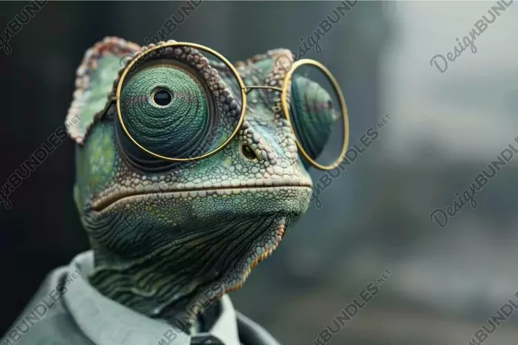 Surreal chameleon portrait with vintage glasses on misty bac example image 1