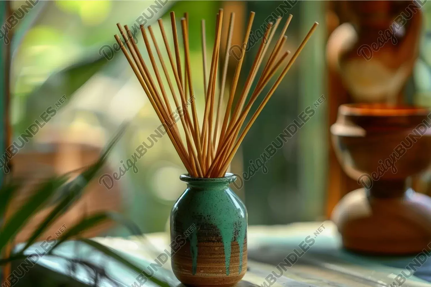 Reed diffuser sticks in a stylish ceramic vase on a serene, natureinspired backdrop