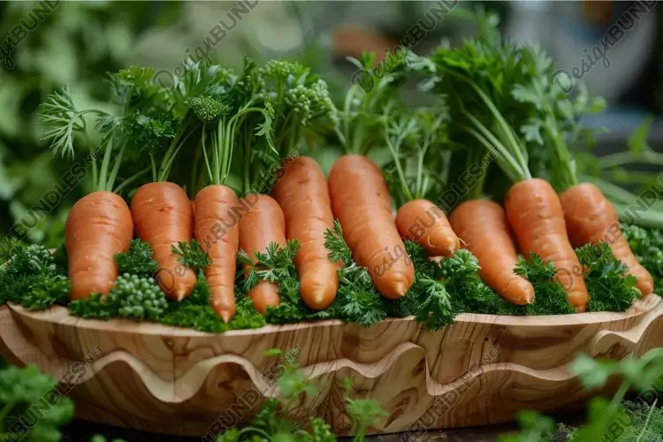 Similar Design Products to Freshly picked carrots resting on parsley in carved wooden b