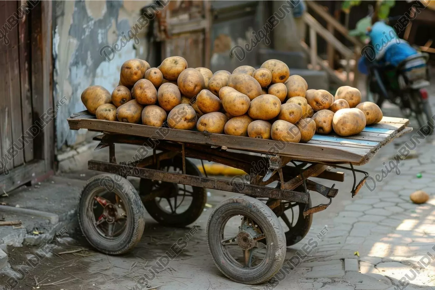 Old Food Street Wooden Vegetable Potato Full Cart Potatoes Cobblestone