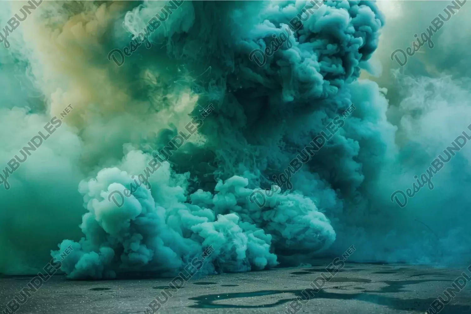 Turquoise and green smoke billowing over wet asphalt example image 1