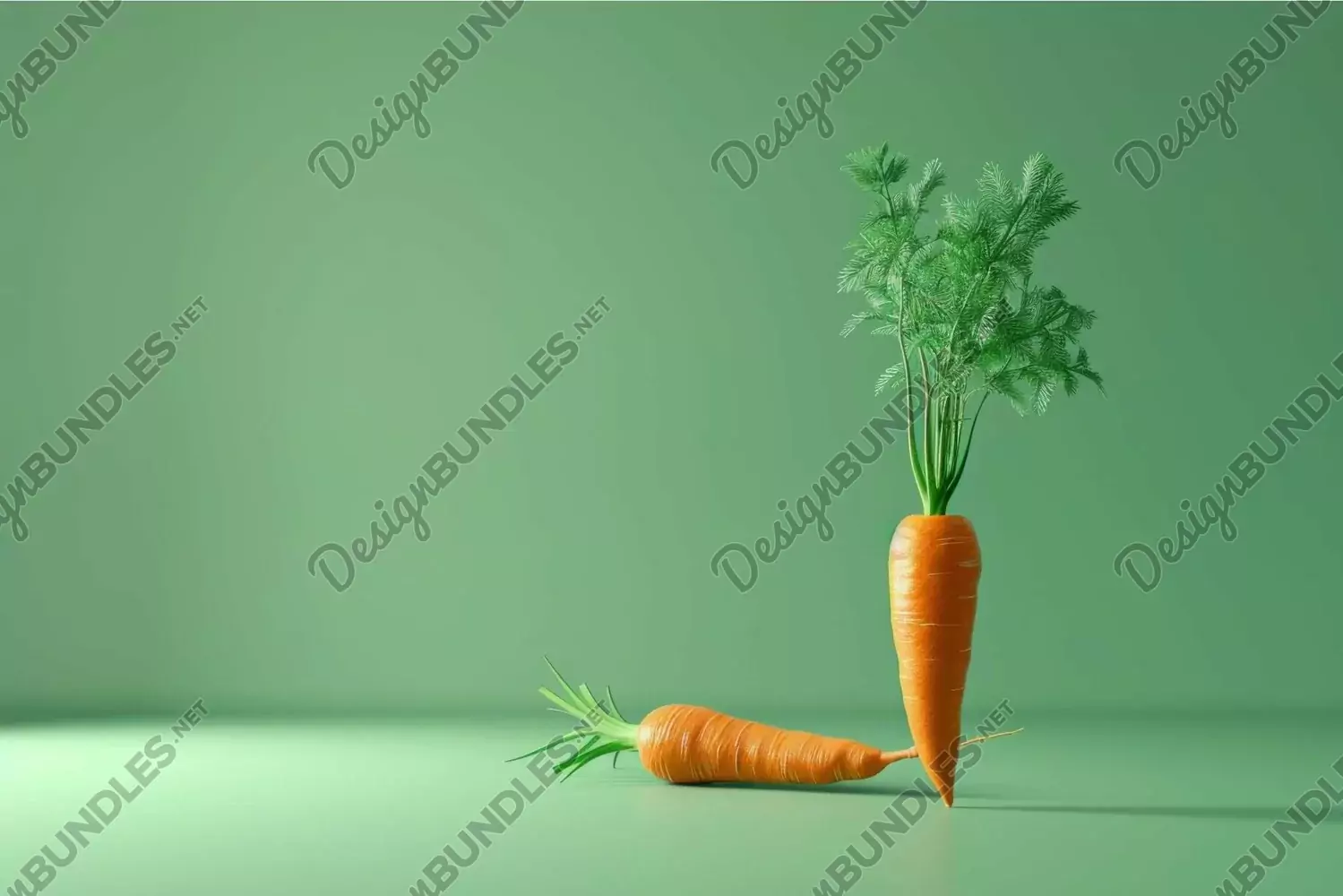 Two fresh orange carrots standing on a green background with copy space