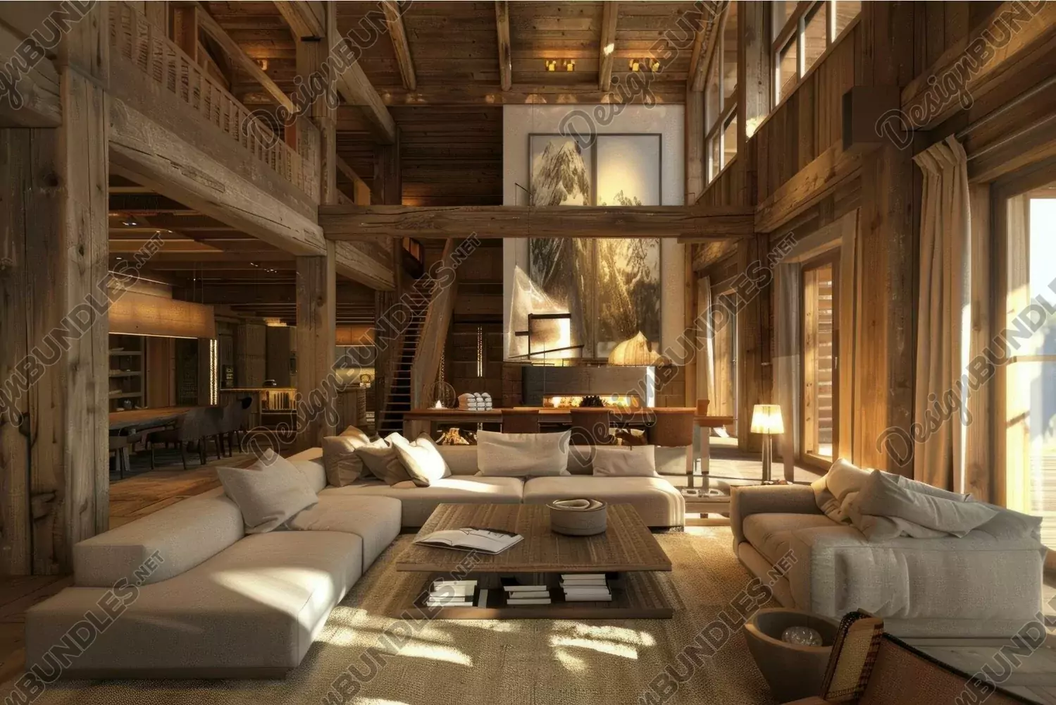 Sunlight illuminating a modern living room with a second floor balcony and a large painting of a mountain