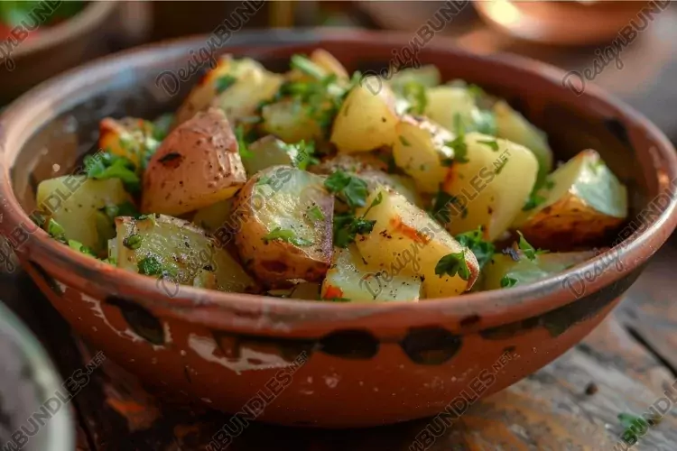Rustic bowl overflowing with roasted potatoes and fresh herb example image 1